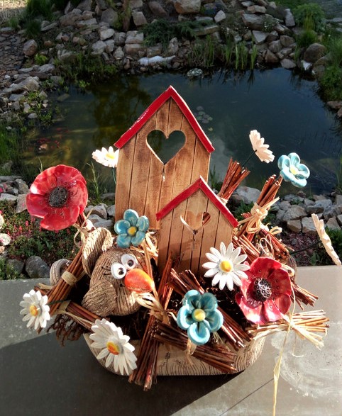 Součástí celé sady je truhlík o šířce cca 30cm. Uvnitř je ptáček, 2 budky, 2 vlčí máky, 3 pomněnky, 6 kopretinek. Bude Vám dělat radost celé roky. Cena je za celek všeho, co vidíte na fotografii bez vrbové dekorace.