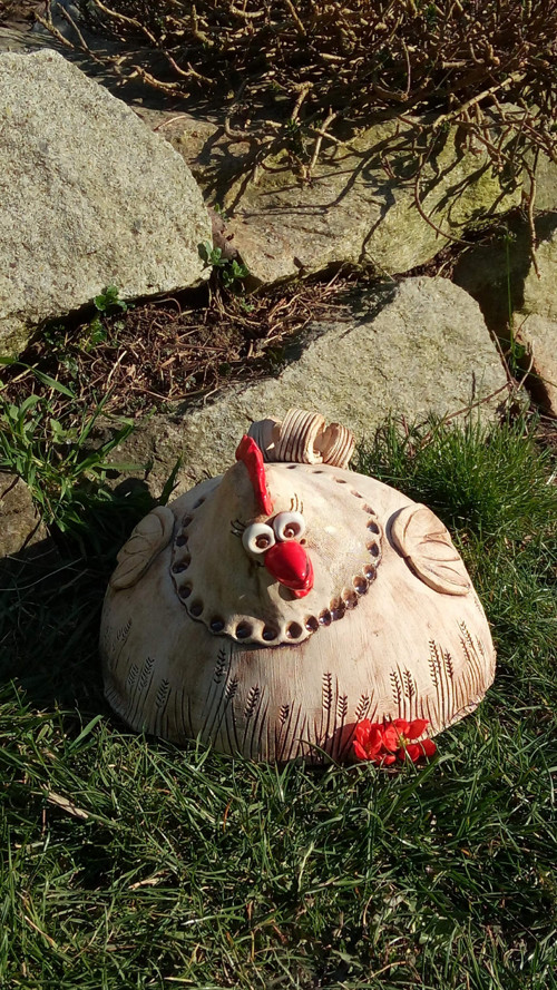 Keramická slepička Vám vyzobe všechna zrníčka :-) Je vyrobená z keramické šamotové hlíny, vymývaná oxidy, pálena na 1100 stupňů. Může být celoročně venku.