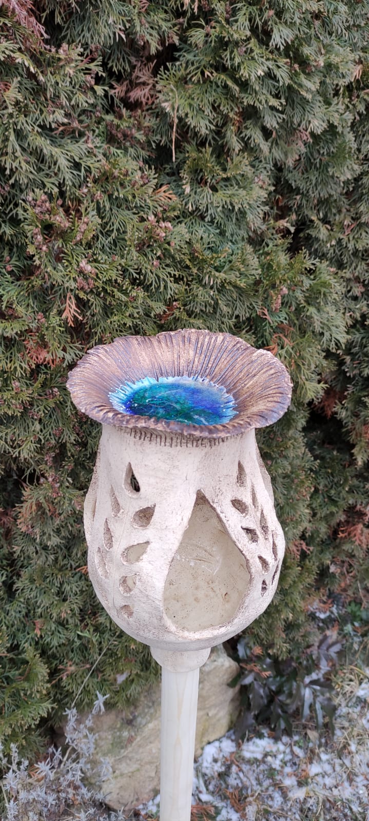 Krmítko, které může v létě sloužit jako pítko pro ptáčky, je vyrobeno z keramiky, páleno na 1170stupňů. Horní miska zdobena taveným sklem. Pítko je upevněno na dřevěné masivní noze, která je v dolní části optřena kovovým bodcem pro usnadnění zapíchnutí do země a trvanlivost.